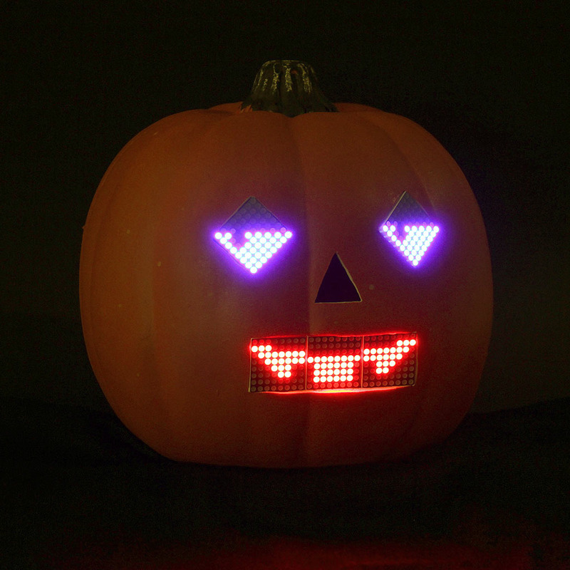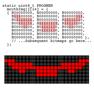 The Arduino binary number notation simplifies the task of creating these shapes; you can practically see the image right in the code. For example, here's one frame of a Jack-o’-lantern mouth: