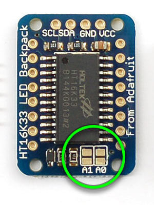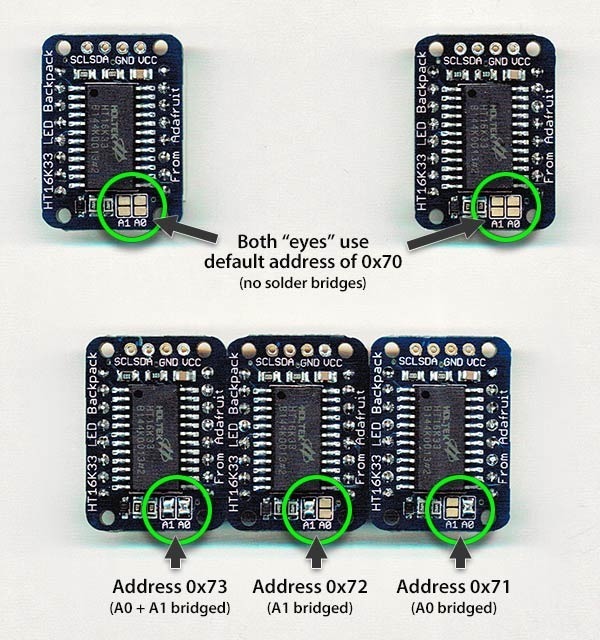 In order to distinguish among multiple devices on the bus, each must be assigned a unique numeric address. Most devices (sensors, etc.) are factory-configured for one specific address, but others (like these LED backpacks) are at least partially configurable. There’s a default address (0x70 in hexadecimal notation) which can then be tweaked by joining some solder pads on the back of the board: