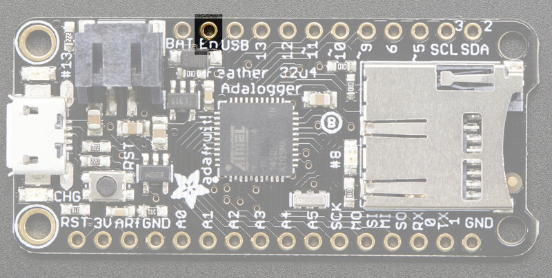 To make this easy we stuck a double-100K resistor divider on the BAT pin, and connected it to D9 (a.k.a analog #7 A7). You can read this pin's voltage, then double it, to get the battery voltage.