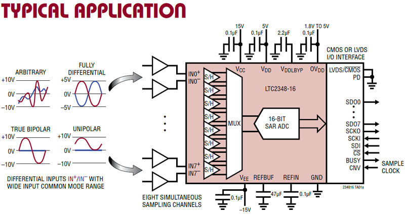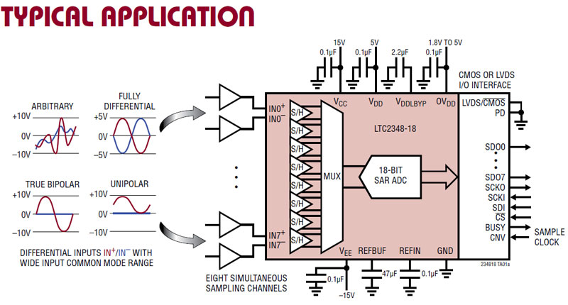 The LTC2348 ADCs support pin-selectable SPI CMOS (1.8 V to 5 V) and LVDS serial interfaces. Between one and eight lanes of data output may be employed in CMOS mode, allowing the user to optimize bus width and throughput. The LTC2348 ADCs are perfect for power line monitory, process control, and programmable logic controllers.