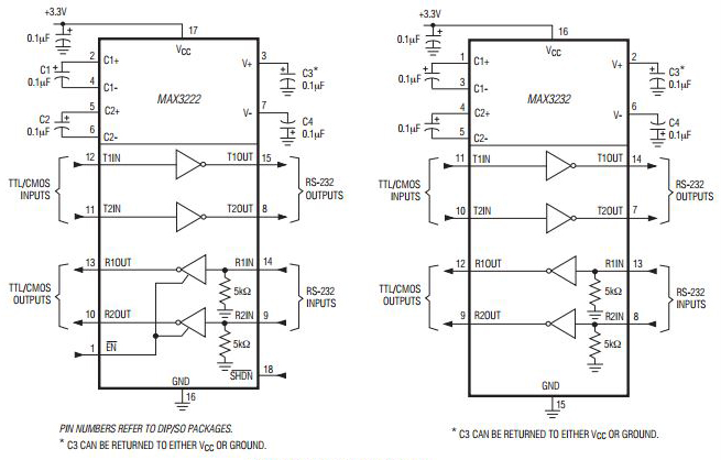The MAX3222 and MAX3232 have two receivers and two drivers. The MAX3222 features a 1 µA shutdown mode that reduces power consumption and extends battery life in portable systems. Its receivers remain active in shutdown mode, allowing external devices such as modems to be monitored using only 1 µA supply current. The MAX3222 and MAX3232 are pin, package, and functionally compatible with the industry-standard MAX242 and MAX232, respectively.