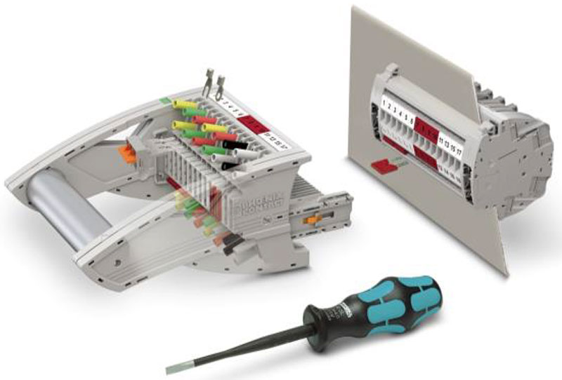 Phoenix Contact's FAME (fast and modular energy) test system is comprised of two components: a base test unit with terminal points and a removable handle that facilitates the test operation. Circuits are wired to the back of the base unit, inside the cabinet. FAME can be configured in 10- or 14-position units to match current industry practices. Technically, FAME can accommodate a range of 4 to 25 positions. The base test unit, which is equipped with ring-lug terminal connections, incorporates jumpers, test plugs, and marking channels. It is installed "through the wall" in the switchgear cabinet door, which enables relay technicians to perform test and measurement operations from outside the cabinet. The base unit matches existing door cutouts, making it ideal for retrofits. The handle, with safety test leads and adapters, plugs into the base test unit for the effective protection, metering, and control of hazardous circuits. To further enhance operator safety, blind plugs (to prevent unintended access) and clear covers can be added.