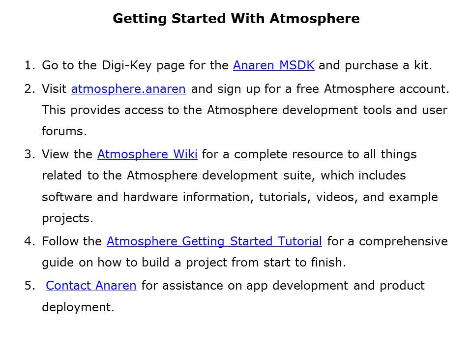 To get started with Atmosphere, there are plenty of resources and areas with information: Start by going to the DigiKey page for the Anaren MSDK and purchase a kit. Visit the Atmosphere website and sign up for a free Atmosphere account. This provides access to the Atmosphere development tools and user forums. View the Atmosphere wiki for a complete resource to all things related to the Atmosphere development suite, including software and hardware information, tutorials, videos, and example projects. Follow the Atmosphere Getting Started Tutorial for a comprehensive guide on how to use Atmosphere to build a project from start to finish. Contact Anaren for further assistance on app development and product deployment.