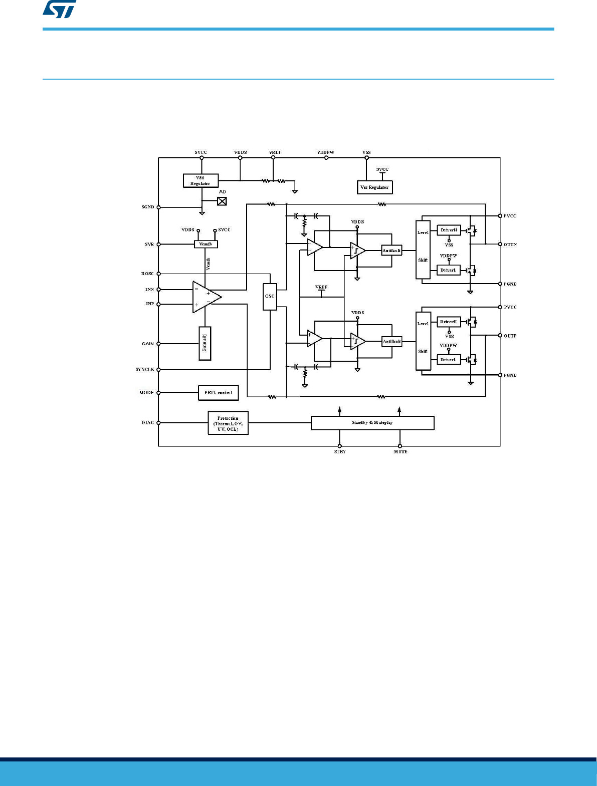 The figure below shows the block diagram of one of the two identical channels of the TDA7498E.