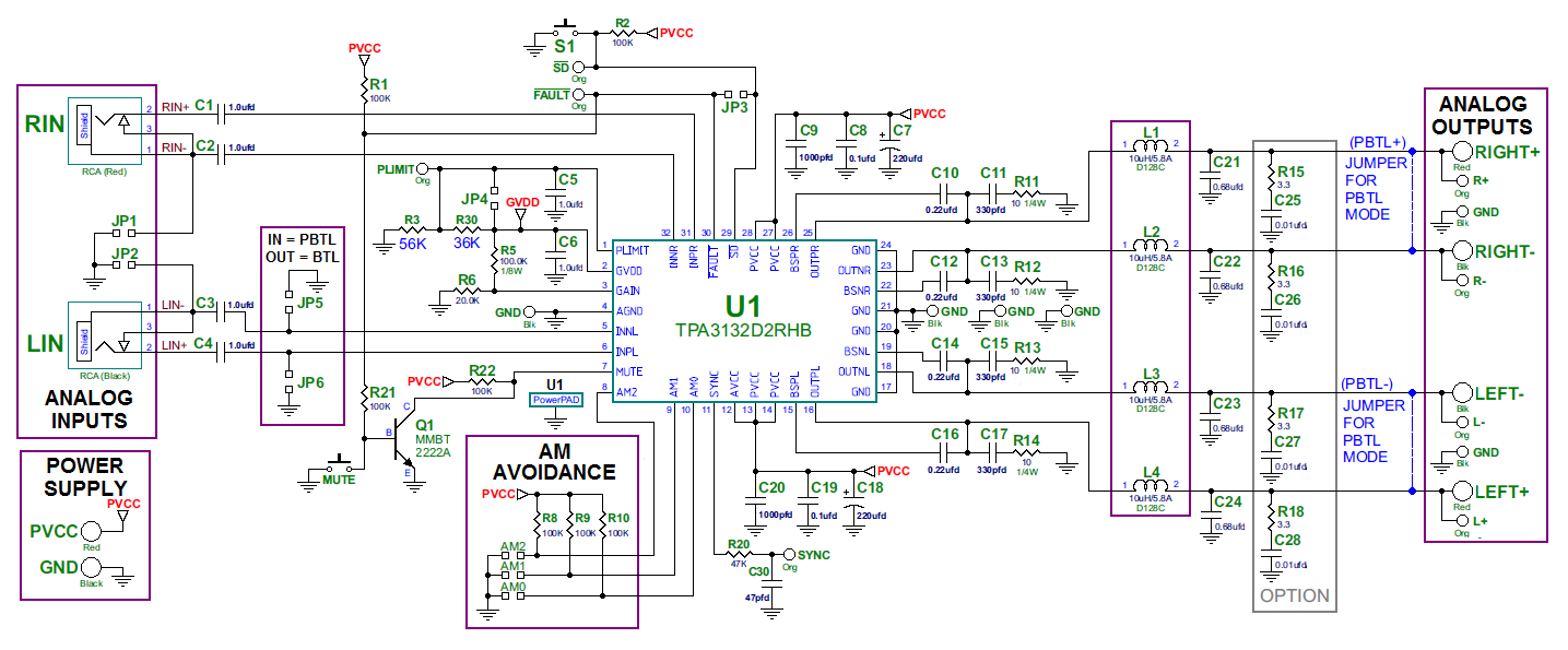The TPA3131/32D2 advanced oscillator/PLL circuit employs a multiple switching frequency option to avoid AM interferences; this is achieved together with an option of Master/Slave option, making it possible to synchronize multiple devices.
